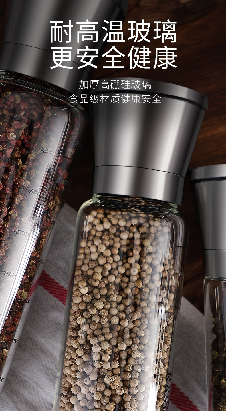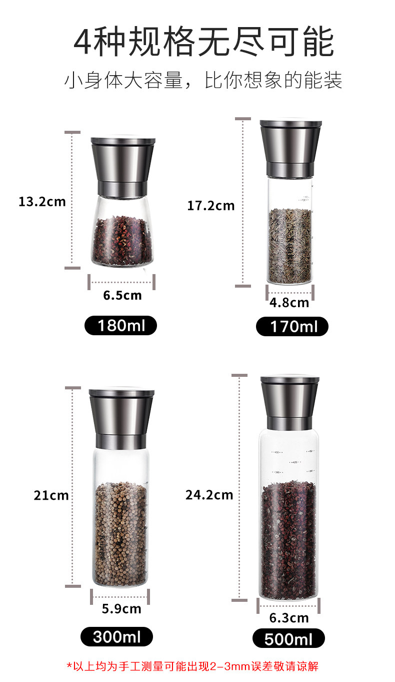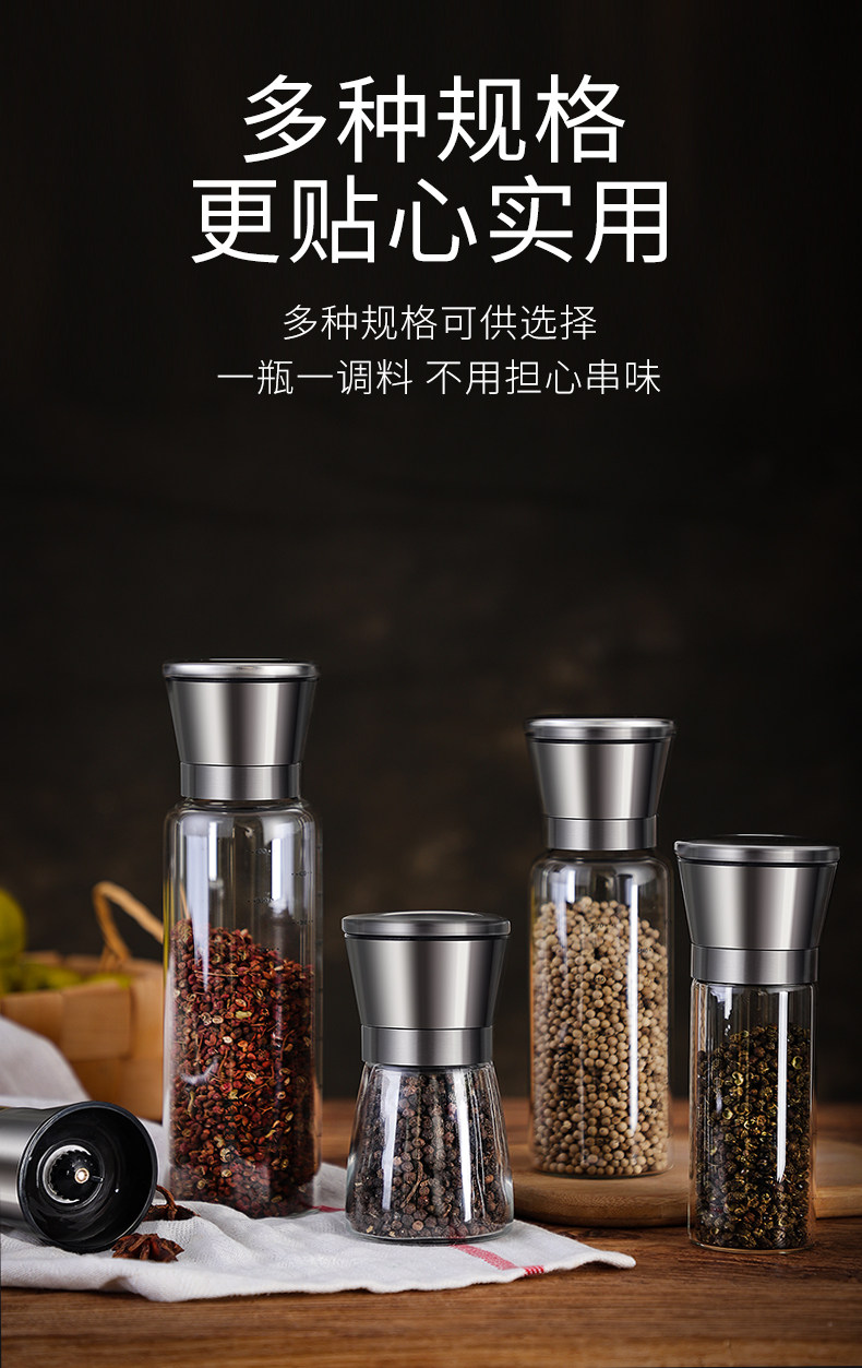 颜色分类: 【超值3件套】180mL研磨器X1+100mL撒料瓶X2 【超值3件套】170mL研磨器X1+100mL撒料瓶X2 【超值3件套】300mL研磨器X1+100mL撒料瓶X2 不锈钢盖+无铅玻璃【180ml一只装】 不锈钢盖+无铅玻璃【180ml两只装】 不锈钢盖+耐高温玻璃【170ml一只装】 不锈钢盖+耐高温玻璃【170ml两只装】 不锈钢盖+耐高温玻璃【300ml一只装】 不锈钢盖+耐高温玻璃【300ml两只装】 不锈钢盖+耐高温玻璃【500ml一只装】 不锈钢盖+耐高温玻璃【500ml两只装】 (调味瓶6件套)中号嘴 莫斯500MLX2+研磨器X1+带孔调味瓶X3 (调味瓶6件套)按压嘴 沃克500MLX2+研磨器X1+带孔调味瓶X3 (调味瓶6件套)大号嘴 辛迪500MLX2+研磨器X1+带孔调味瓶X3货号: 旋转研磨器
