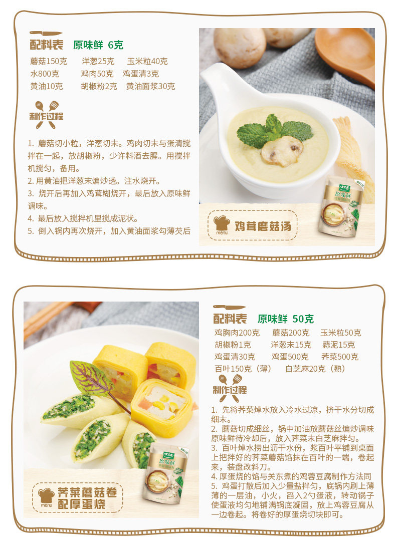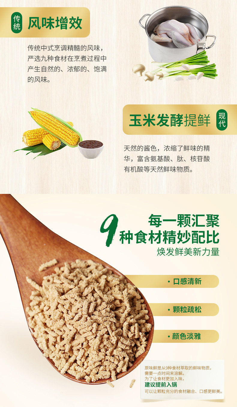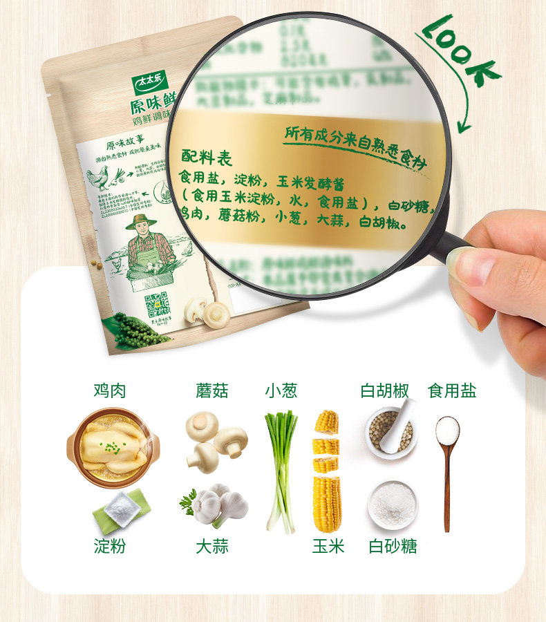 配料表:食用盐,淀粉,玉米发酵酱(食用玉米淀粉,水,食用盐),白砂糖,鸡肉,蘑菇粉,小葱,大蒜,白胡椒。