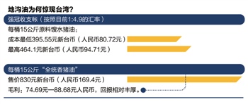 据台湾媒体报道,一桶15千克的强冠公司“全统香猪油”售价在830元新台币,折合人民币169.4元。而强冠公司董事长叶文祥公布的馊水油原料油15千克最高成本在464.1元新台币,毛利约为365.9新台币,折合人民74.69元,获利丰厚。