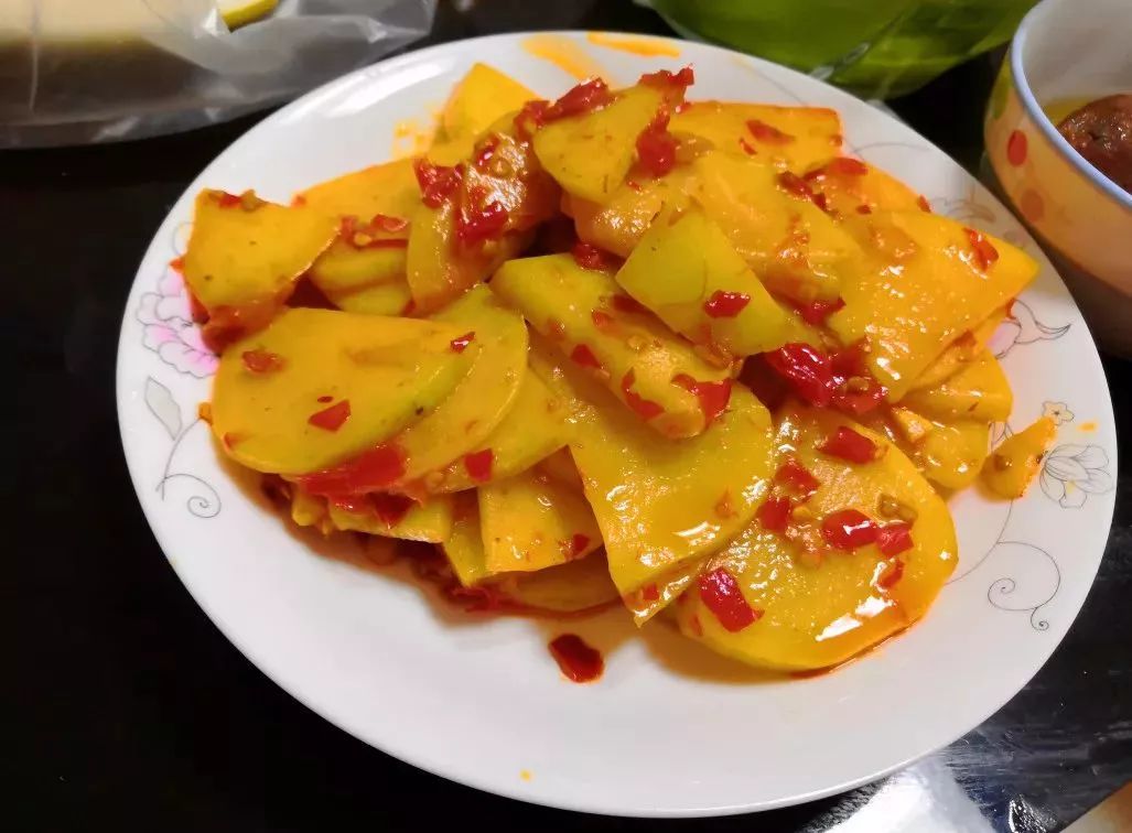 6.炒锅内放胡油3汤匙,旺火烧至8成热,放入姜丝、洋葱丝、翻炒几下,有香味后放入土豆丝翻炒。然后放入泡辣椒带少量醋,加盐适量,加入西红柿后加白糖一汤匙,翻炒到汤汁红色后加酱油调色,淋香油出锅。