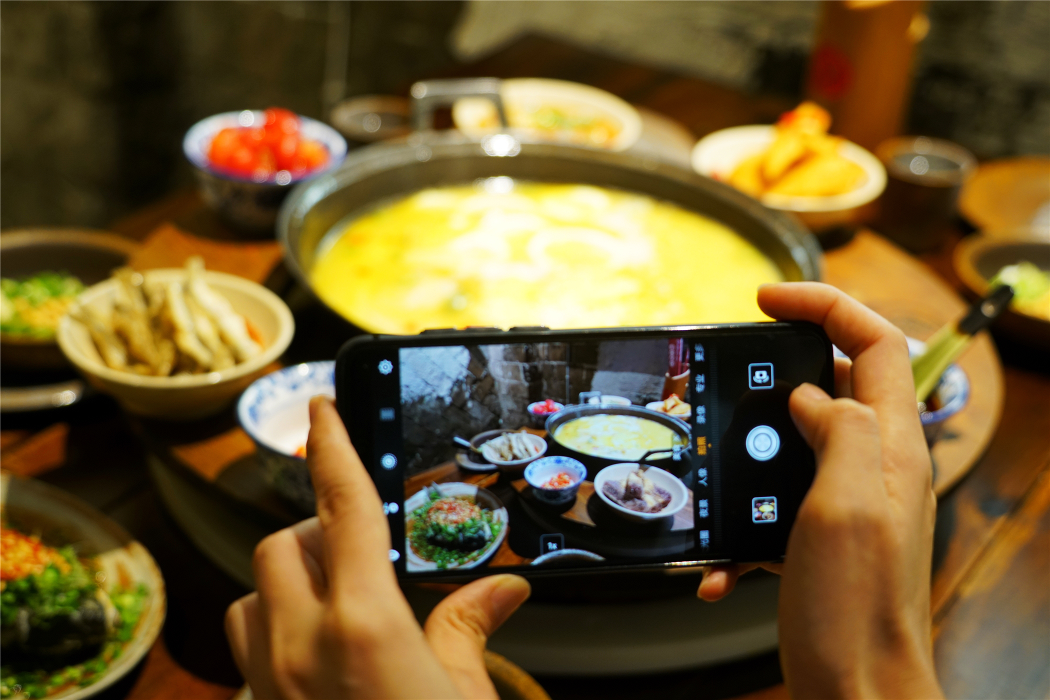 等我们点的所有小吃都摆上来之后,先拍个全家福,光是卖相看着就很养眼了,我点的这份酸菜鱼古法火锅,更适合不太能吃辣的人,鹅卵石烫熟的鱼片,吃起来鲜嫩Q弹,有着鱼肉的鲜香,又有酸菜的入味,口感真的很喜欢。