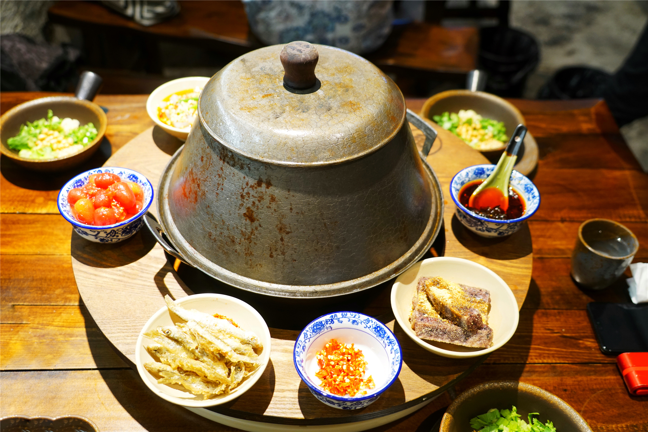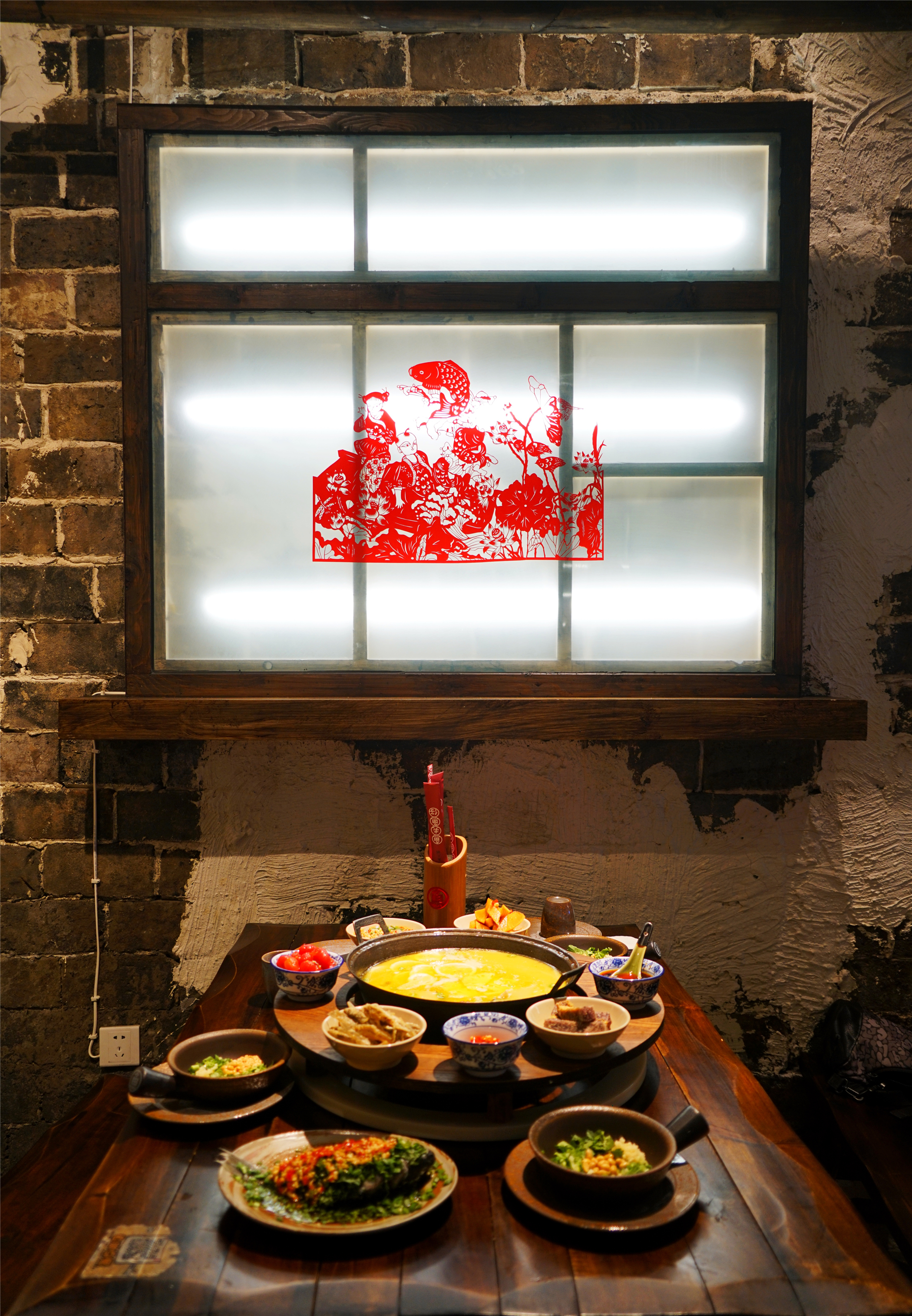 致民路渔夫渔仔,随着服务生带有成都韵味的一声时来运转,一个带有石头的古法酸菜锅引起了我的无限好奇,我们点的各色小菜,也都色彩纷呈的端上来了,和火锅搭配,光是视觉就是很美的享受了。