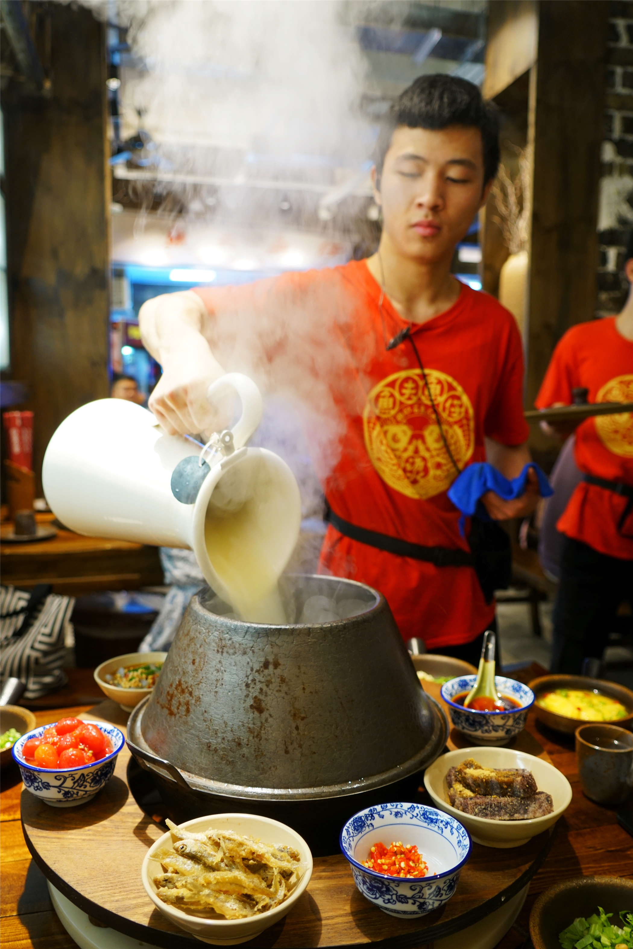 我点了这里最经典的古法酸菜鱼火锅,刚刚端上来的火锅跟我们平时吃的大不一样,鹅卵石放在锅底,让人大生好奇,随着服务员一生:石来运转,火锅上的红色条幅打开,接下里的操作才是重点。