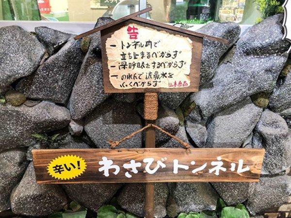 芥末隧道入口的警告标志。好奇的游客可以用它来体验刺激鼻子的刺鼻气味。