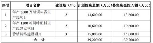 招股说明书显示,仲景食品将募集资金3.92亿元,其中年产3000万瓶调味料生产线投资1.36亿元,年产1200吨调味料生产线投资1.06亿元,其余1.5亿元将用于营销网络建设。