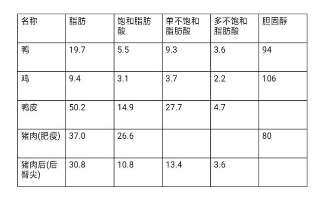 从以上表中各畜禽类所含脂肪、胆固醇可以看出,鸭皮的脂肪是非常之高,而且鸭皮中所含的胆固醇也高于鸭肉本身。